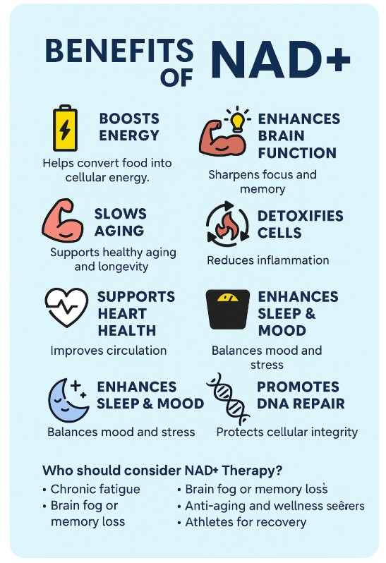 NAD⁺ (Nicotinamide Adenine Dinucleotide) is a vital coenzyme found in every cell of the body. It plays a major role in cellular energy production and overall health. Below are the top benefits of NAD⁺ therapy, especially when delivered intravenously (NAD IV Therapy):